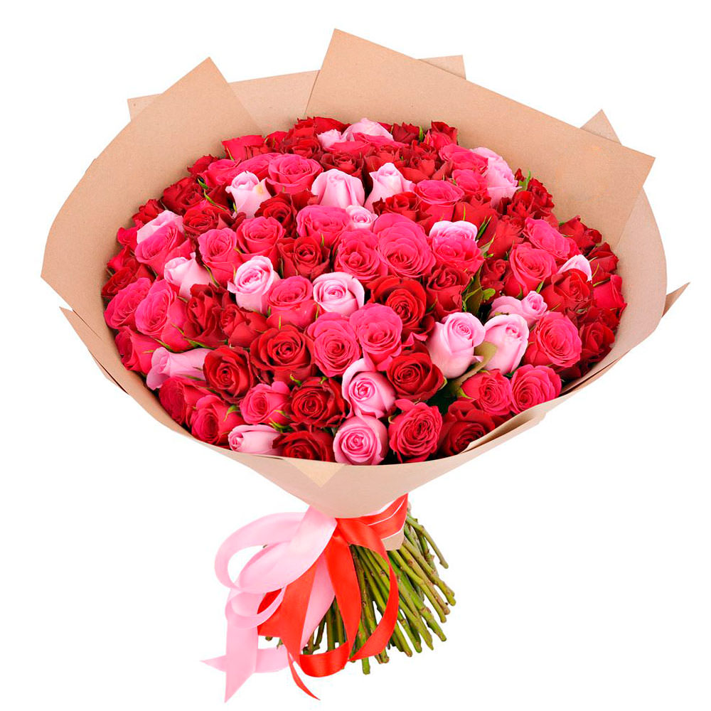 Роза одноголовая, роза кустовая микс (несколько оттенков розового). Упаковка (лента, пленка, крафт, сетка, пленка матовая)