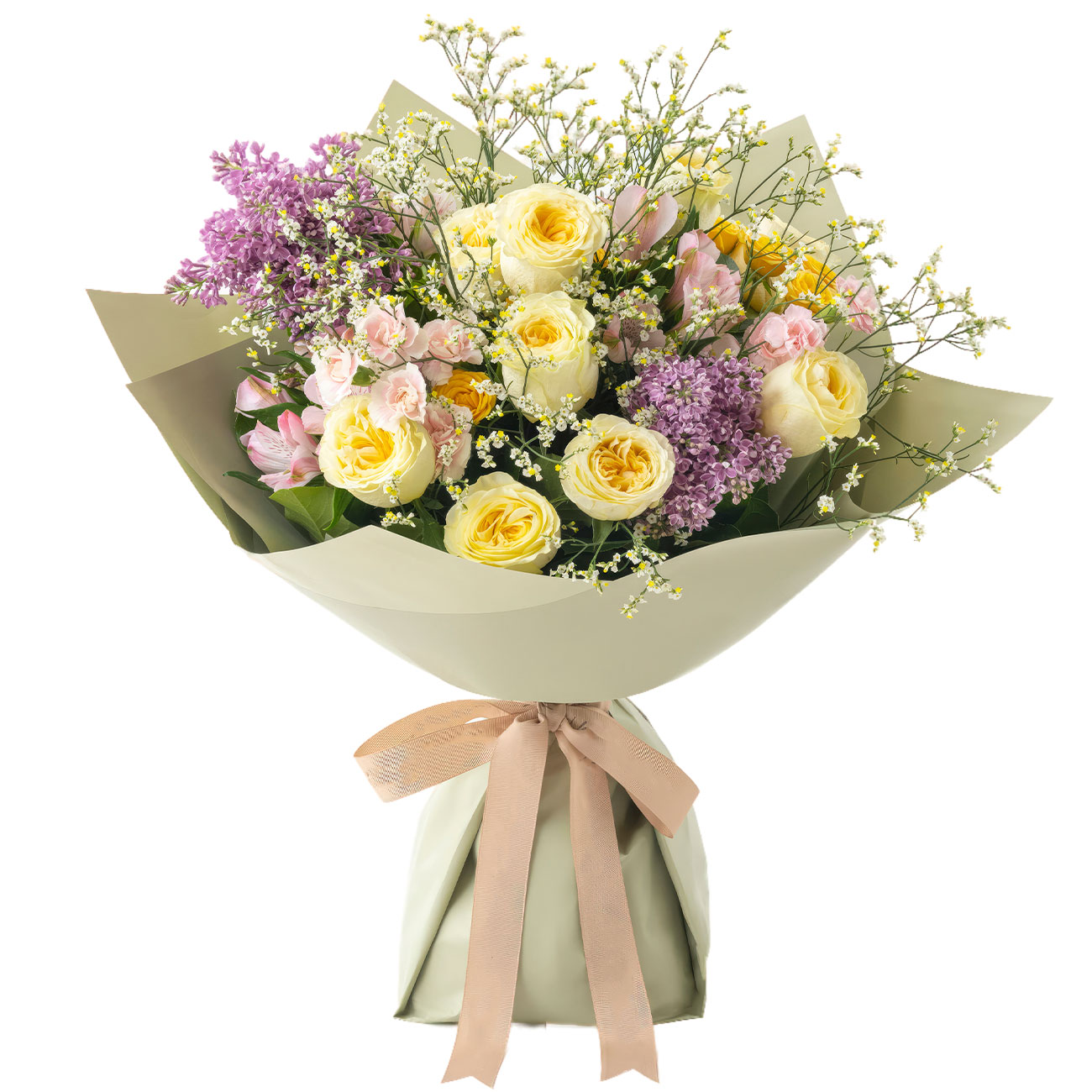 Роза пионовидная желтая, сирень, альстромерия розовая, роза кустовая желтая, вероника, зелень. Упаковка (лента, пленка, крафт, сетка, пленка матовая)