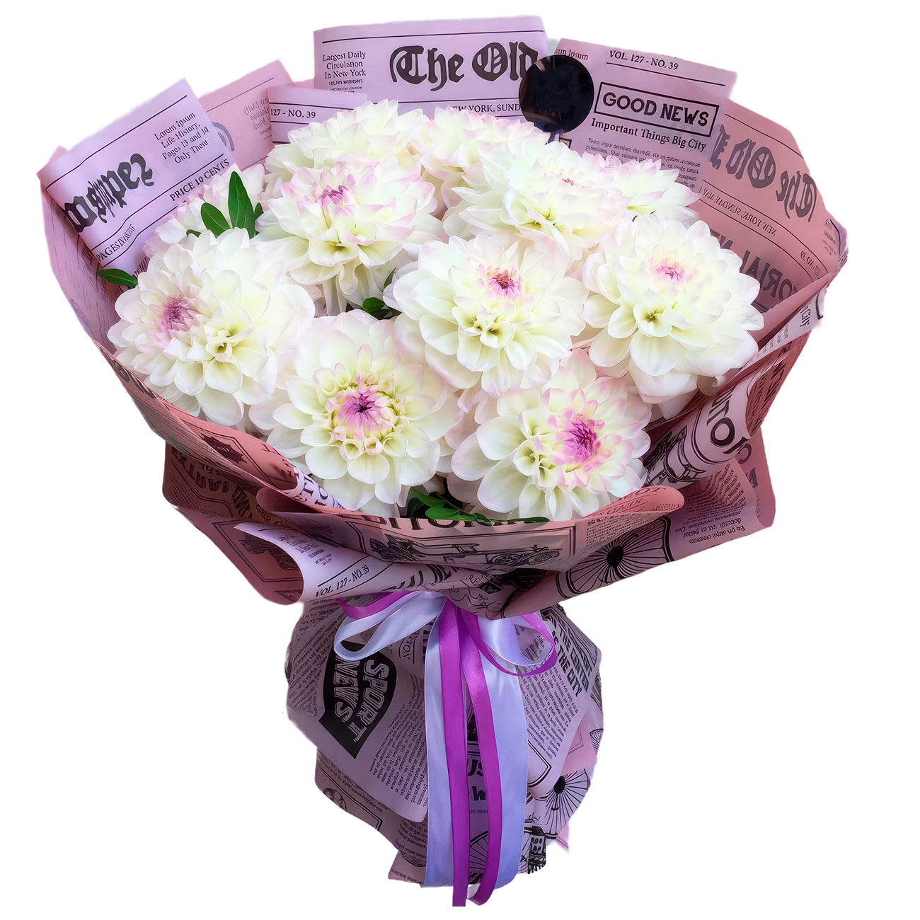 Георгина белая, эвкалипт, сухоцвет (аспарагус стабилизированный). Упаковка (лента, пленка, крафт, сетка, пленка матовая)