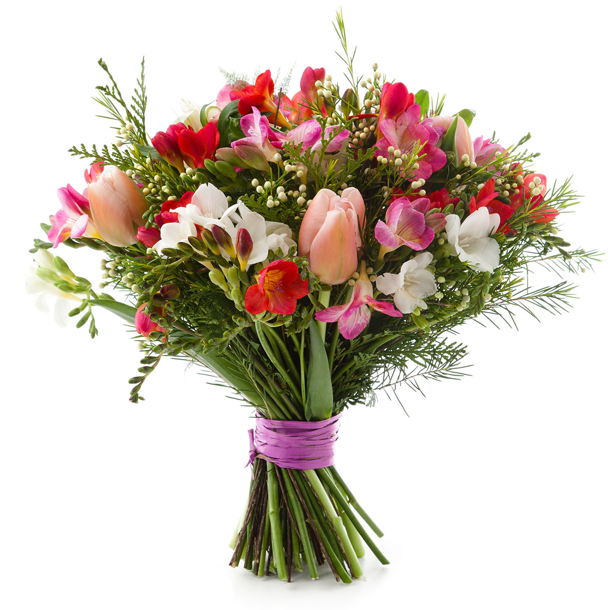 Тюльпан розовый, фрезия белая, красная и розовая, озотамнус, зелень. Упаковка (лента, пленка, крафт, сетка, пленка матовая)