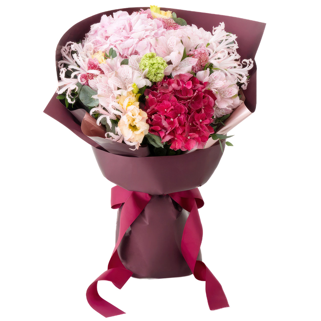Гортензия розовая и темно-розовая, эустома кремовая, альстромерия розовая, гвоздика, салал, вибурнум эвкалипт. Упаковка (лента, пленка, крафт, сетка, пленка матовая)