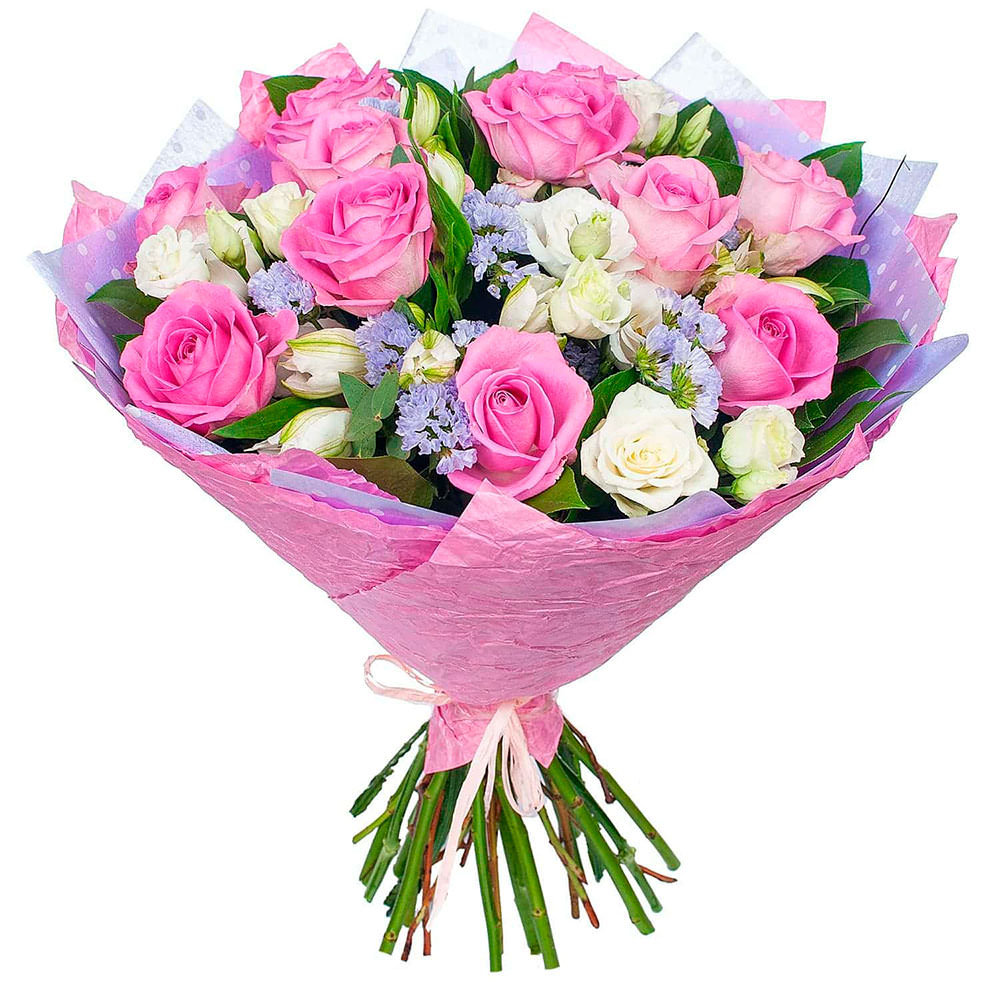 Роза одноголовая розовая, альстромерия белая, роза кустовая белая, статица голубая. Упаковка (лента, пленка, крафт, сетка, пленка матовая)