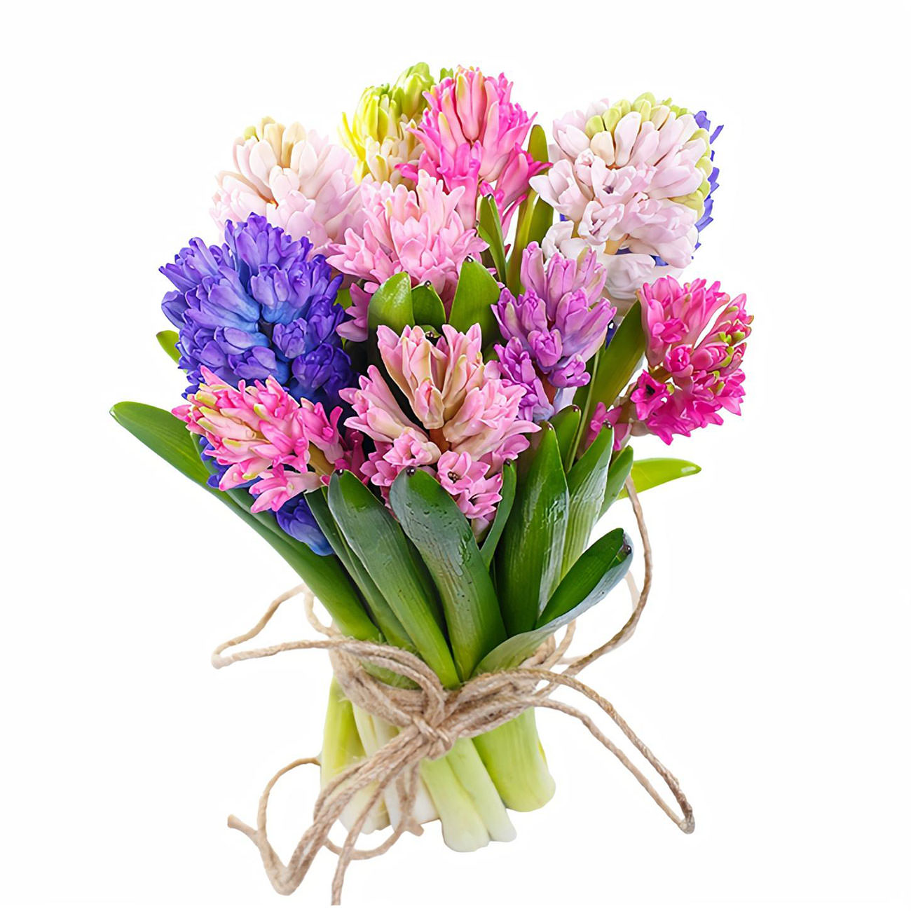 Гиацинты розовые, сиреневые, фиолетовые, бежевые, зеленые.