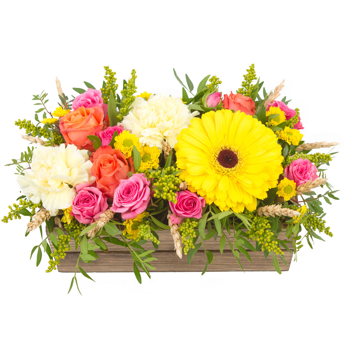 Гербера желтая, гвоздика белая, роза кустовая розовая и желтая, роза одноголовая красная, колос, зелень. Упаковка (Корзина, оазис, ящик).