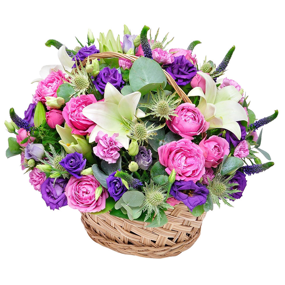 Роза пионовидная кустовая розовая, эустома фиолетовая, лилия белая, гвоздика кустовая мини розовая, вероника, эрингиум, эвкалипт. Упаковка (Корзина, оазис).