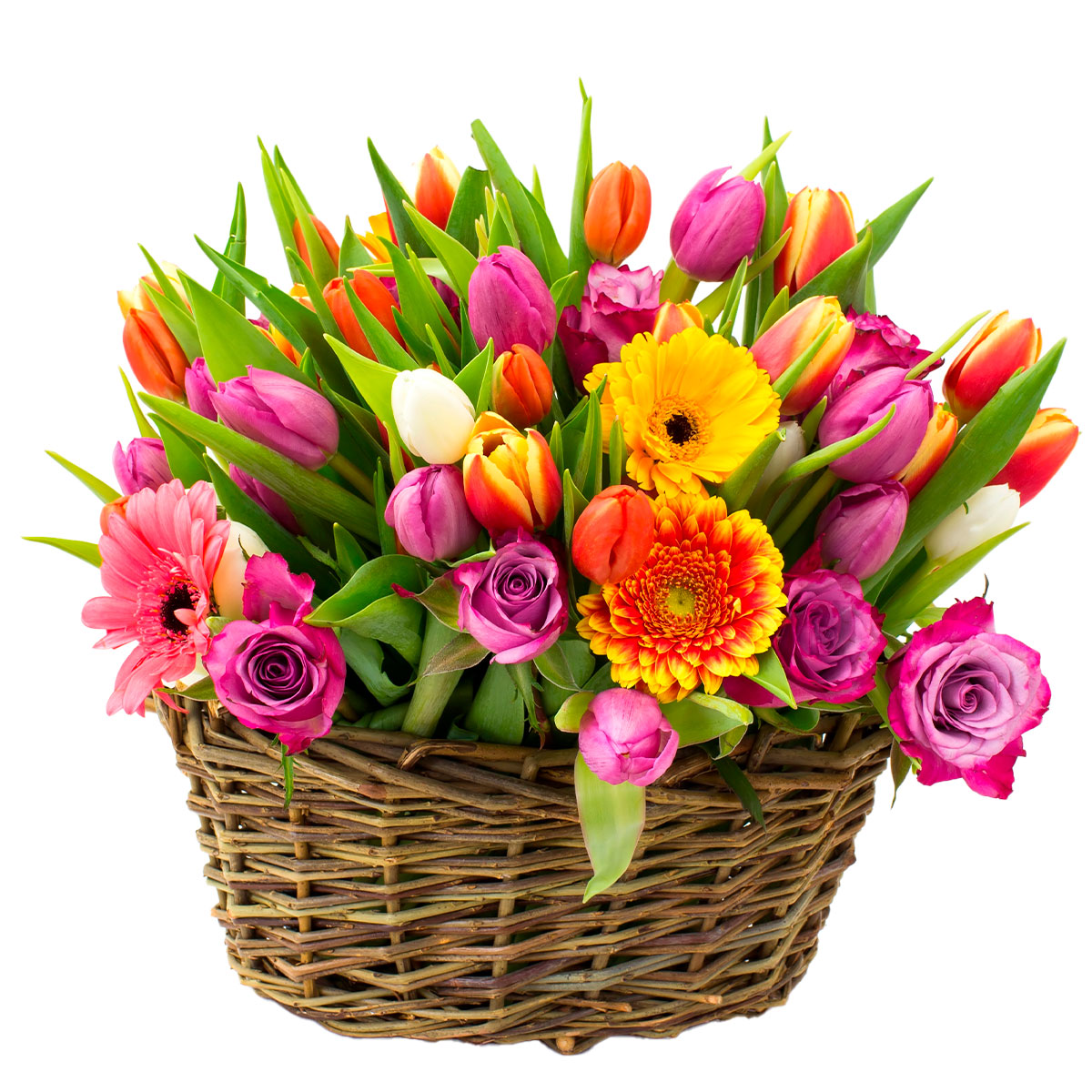 Гербера желтая и оранжевая, роза одноголовая сиреневая, тюльпан желто-оранжевый, белый и розовый. Упаковка (Корзина, оазис, ящик).