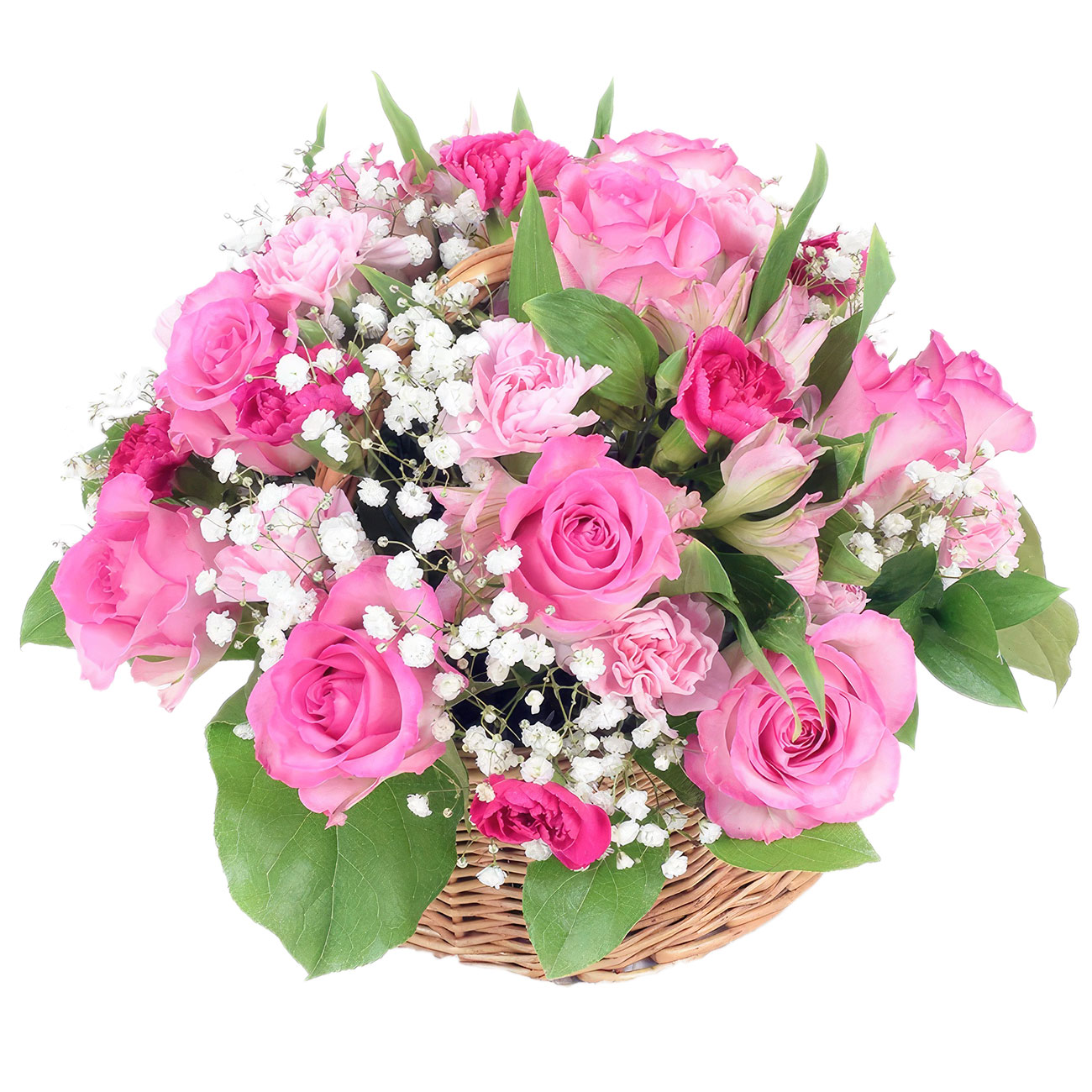 Роза одноголовая розовая, диантус розовый, альстромерия розовая, гипсофила. Упаковка (Корзина, оазис, ящик).