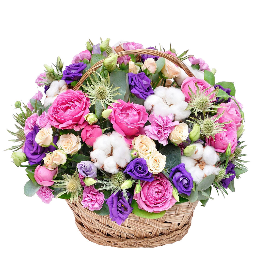 Роза пионовидная розовая, гвоздика кустовая мини розовая, роза кустовая кремовая, эустома фиолетовая, хлопок, эрингиум, эвкалипт. Упаковка (Корзина, оазис).