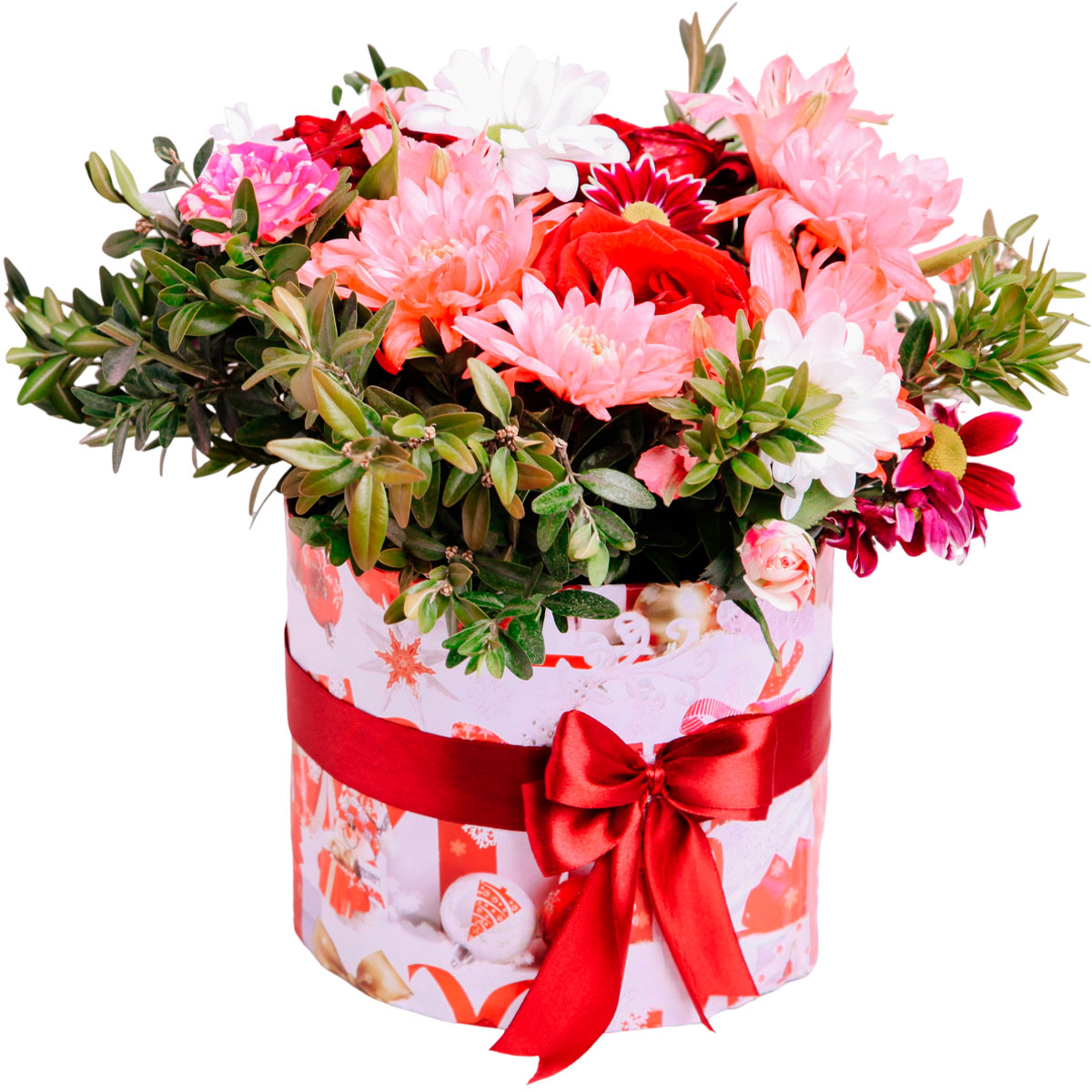 Хризантема кустовая розовая, белая и красная, роза одноголовая красная, зелень. Упаковка (шляпная коробка, квадратный бокс, коробка сердце, оазис)