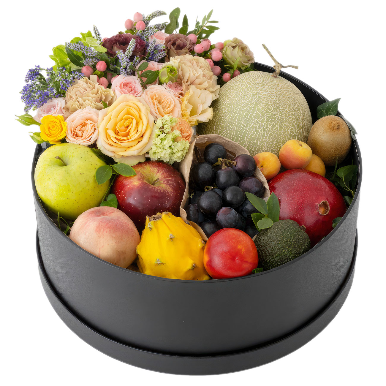 Роза одноголовая кремовая, шалфей фиолетовый, роза кустовая микс, гвоздика голландская, яблоки, персики, виноград, гранат, авокадо и др. Фрукты по наличию. Упаковка (шляпная коробка, квадратный бокс, коробка сердце, оазис)