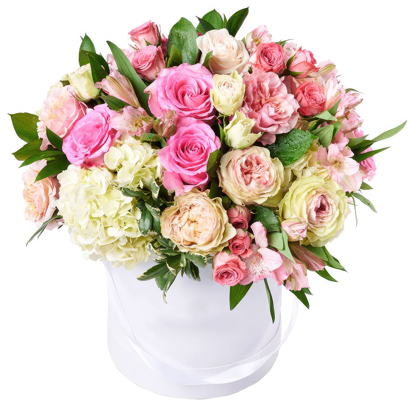 Гортензия белая, роза пионовидная кремовая, роза одноголовая розовая, роза кустовая розовая, альстромерия розовая. Упаковка (шляпная коробка, квадратный бокс, коробка сердце, оазис)