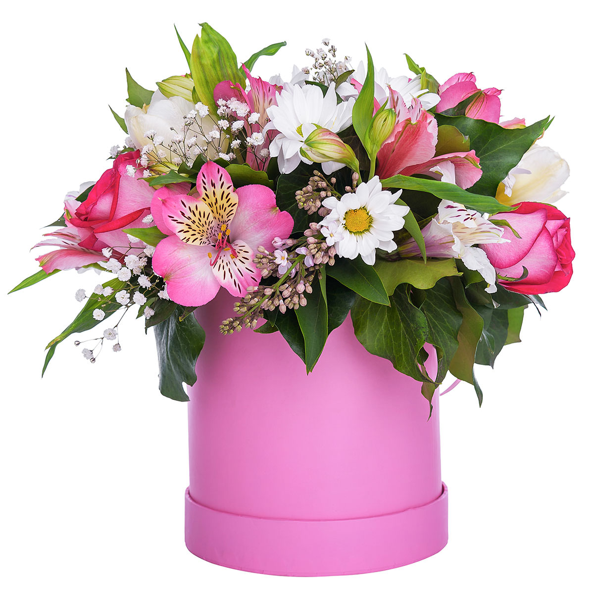 Альстромерия розовая, роза одноголовая розовая, хризантема кустовая белая, сирень, гипсофила. Упаковка (шляпная коробка, квадратный бокс, коробка сердце, оазис)