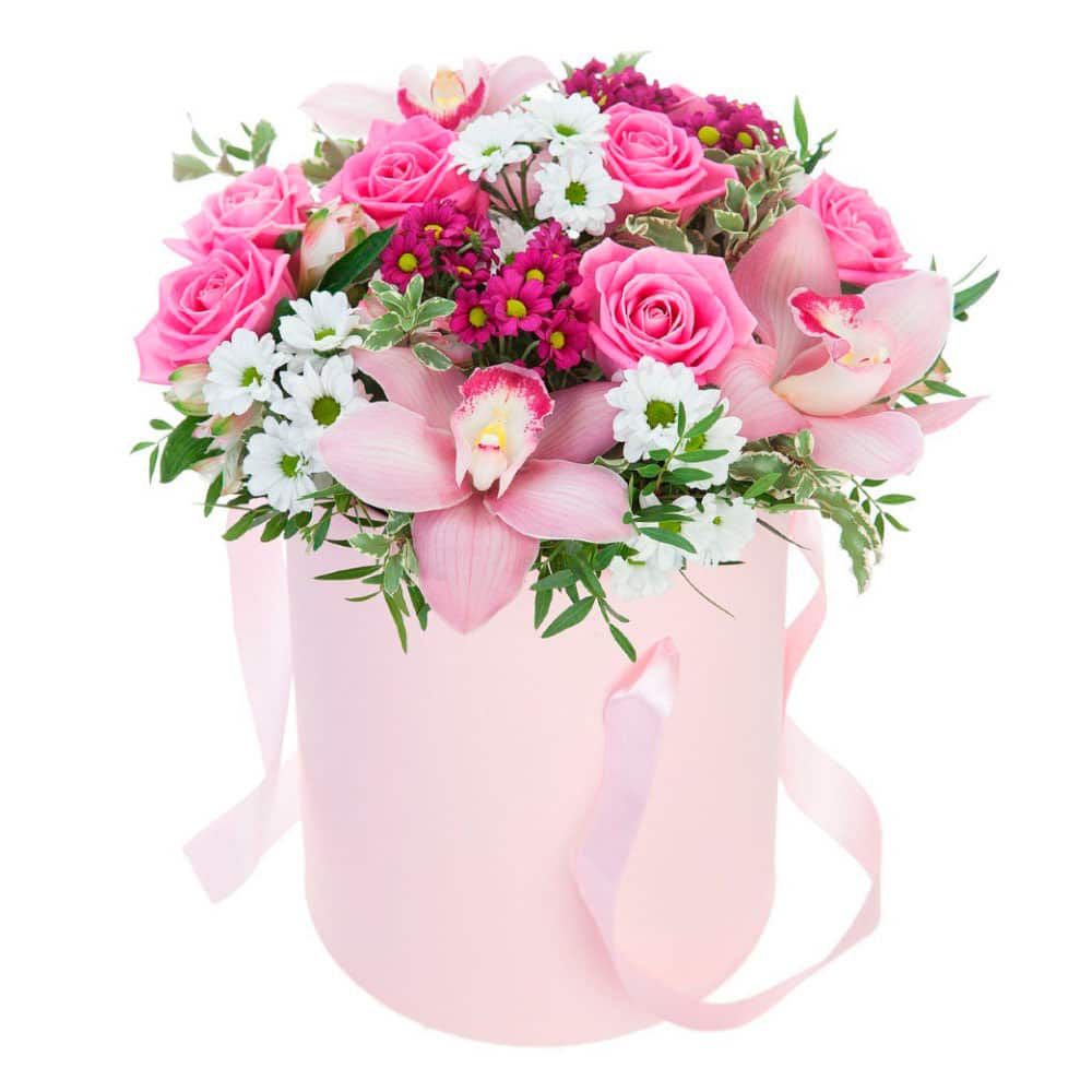 Орхидея розовая, роза одноголовая розовая, хризантема кустовая белая и розовая, фисташка. Упаковка (шляпная коробка, квадратный бокс, коробка сердце, оазис)