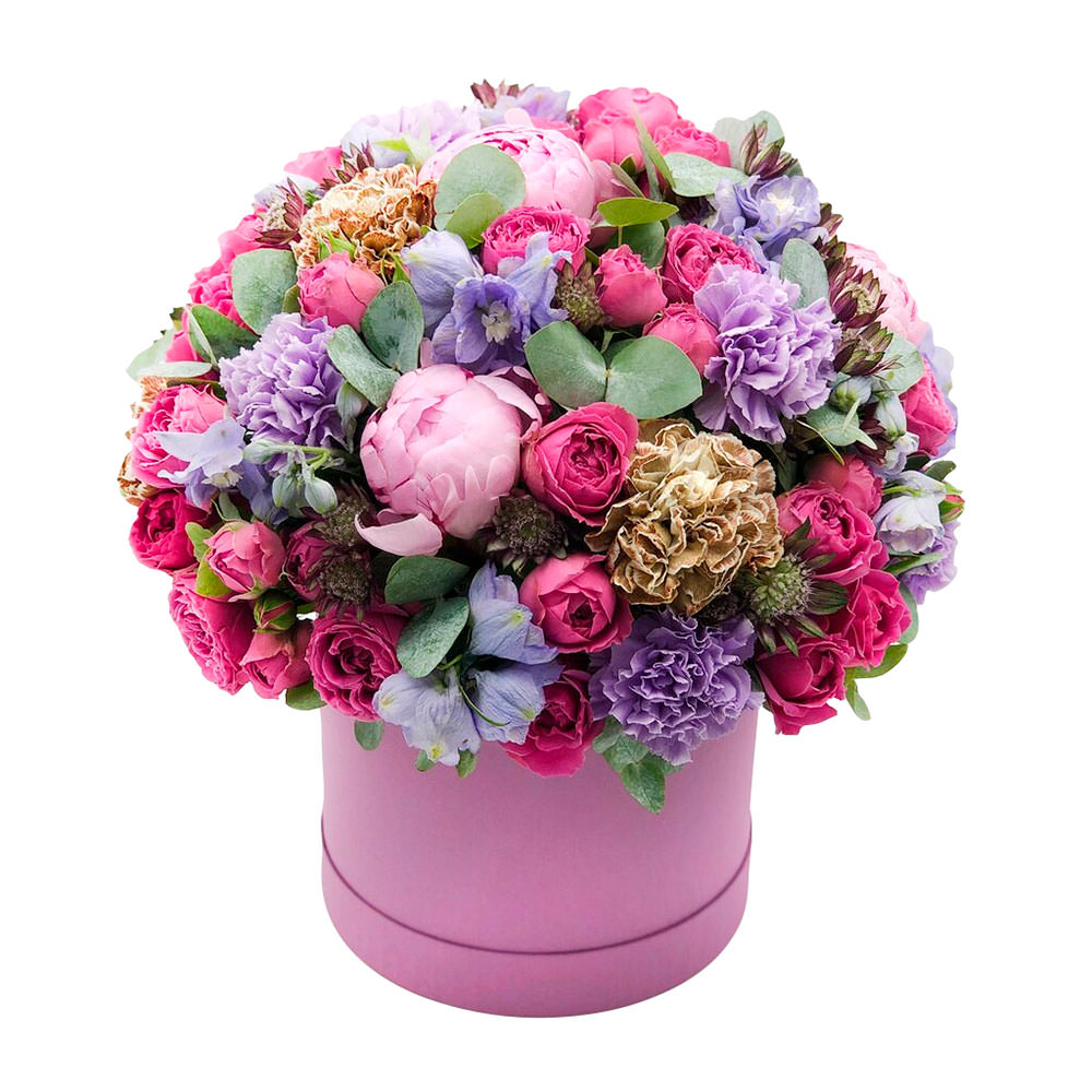 Пион розовый, гвоздика микс (сиреневая, каппучино), роза кустовая пионовидная розовая, фрезия, фисташка. Упаковка (шляпная коробка, квадратный бокс, коробка сердце, оазис)