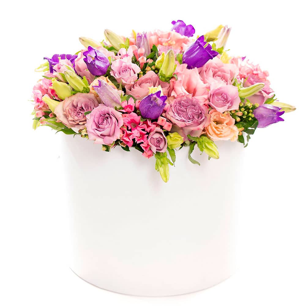 Бавардия, кампанула, роза одноголовая микс (сиреневая, розовая), эустома персиковая, роза кустовая микс. Упаковка (шляпная коробка, квадратный бокс, коробка сердце, оазис)